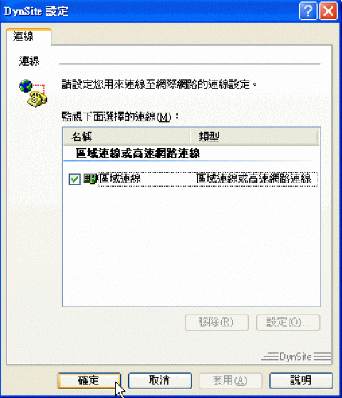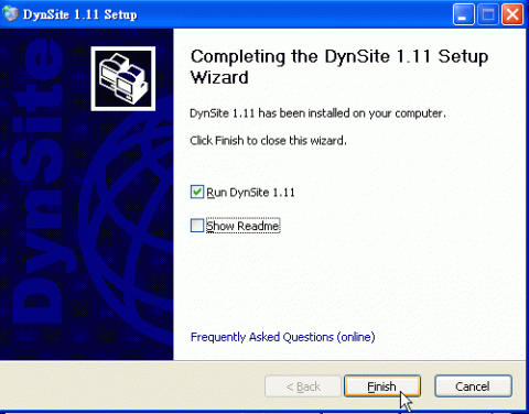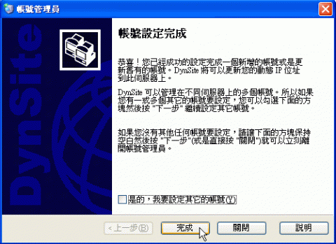 完成設定,點擊完成按鈕,即可開始 DynSite 的連線終端,自動將您的 IP 與我們的動態DNS伺服器連線並完成更新IP的作業。