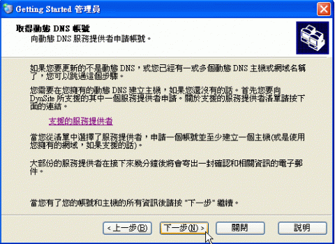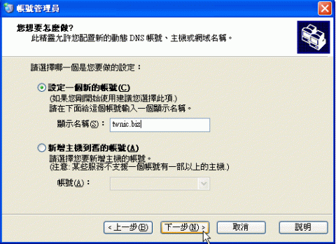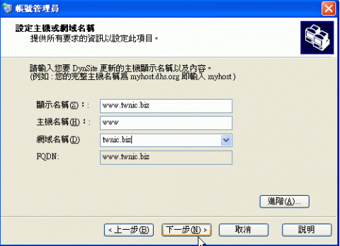 設定網址名稱,設定您欲顯示的名稱,打入您欲動態DNS連線的網址名稱,完成後點擊下一步。