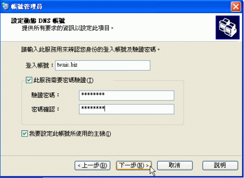 登入帳號: 請輸入您的網址 例如您的網址是 abc.com 請輸入 abc.com 即可,請勿輸入 www,後勾選本服務需要密碼驗證,輸入您於http://www.taiwandns.com 我的帳戶中,動態 DNS設定的密碼。完成後點擊下一步。