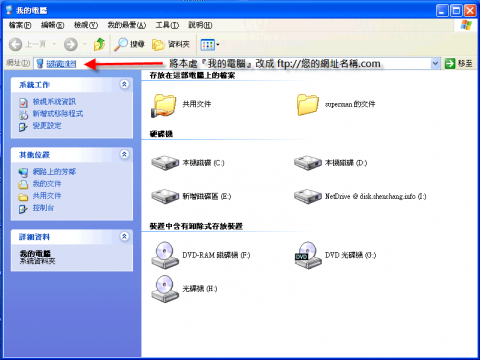 2 請於上方網址列中輸入 ftp://您的網址名稱,再按下Enter鍵確定,如下圖所示。