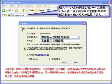 3 隨即會出現登入身分的連線視窗, 請於使用者名稱及密碼欄位輸入主機開立時所提供的登入帳號密碼,並按下登入鈕,如上圖所示。注意事項:請輸入正確的帳號與密碼,如果您遺忘了登入資訊,請至 http://www.webpay.com.tw 客服中心查詢,或來電至客服部門查詢。切勿用猜密碼的方式,這樣將會被入侵偵測系統封鎖了您的IP位置,造成無法連線的問題。
