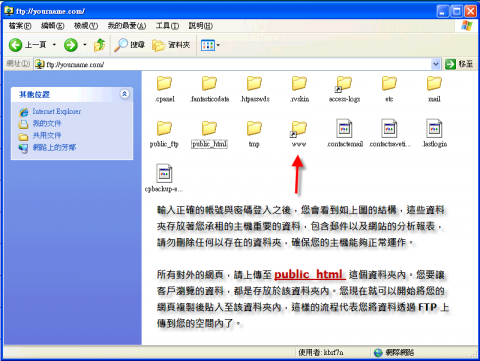 4 接著您會於右方看到資料夾及檔案,就代表已成功連線至遠端站台,再來只需要將您欲上傳的網頁檔,以複製貼上的方式上傳至指定的網頁資料夾:public_html 或 www 皆可。