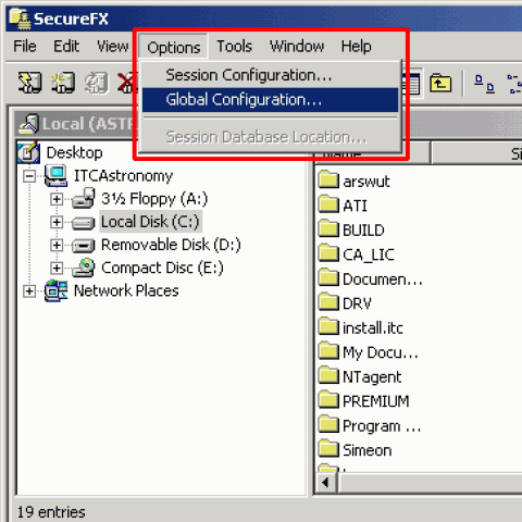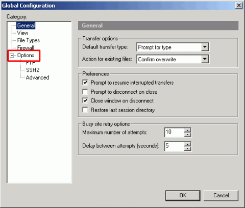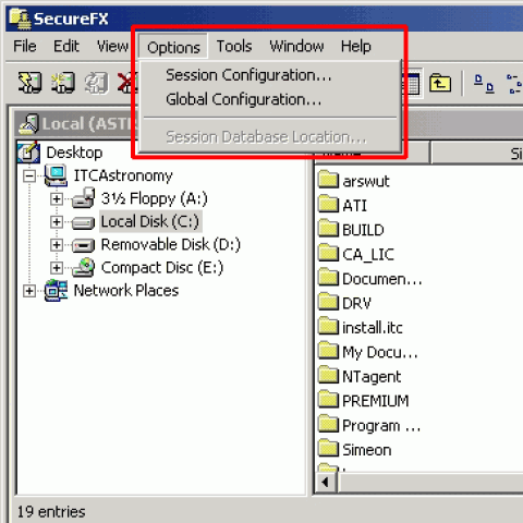 1 若您是使用Secure FX此套FTP登入至您的主机,由于防火墙的关系,如登入FTP服务器时需要很久,或出现无法建立Socket的错误讯息,请使用PORT模式,不要使用PASV模式,要解决此连线无法显示目录的问题,请您开启此FTP软件,点选工具列 Options下拉选单,如下图所示。