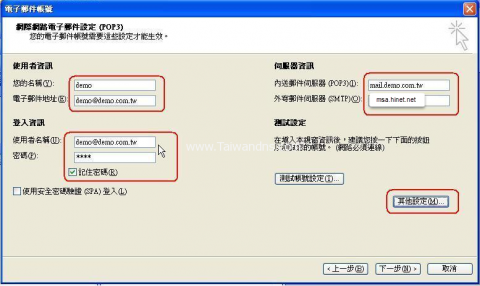 (【demo】就是您在信箱主机管理接口盘自行开设帐号名称,【demo.com.tw】就是您网域名称(记得千万不用加前面的 www)