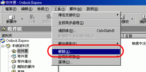 1 首先开启您电脑里Outlook Express在工具列中按 工具(T) 钮,随即出现下拉对话视窗点击 帐号(A)… 钮 (如【图一】所示)………。