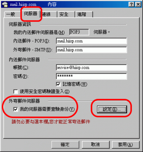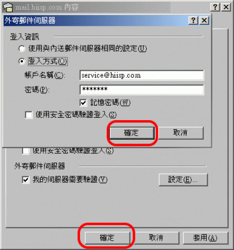 注:在此我们以【service@hiisp.com】为范例说明之;【service】就是您在信箱主机管理接口盘自行开设帐号名称,【hiisp.com】就是您网域名称(记得千万不用加前面的 www) 。