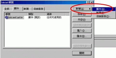 2 随即出现 Internet帐号的对话视窗,选择 新增(A) 钮按下,随即出现下拉对话视窗点击 邮件(M)… 钮 (如【图二】所示)……….。