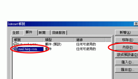 7 此时回到 Internet帐号视窗画面(如【图七】所示),恭喜您看到此视窗画面就代表您已经设定完成,不够我们还有一个小地方要注意勾选设定;仔细瞧瞧您新增 E-mail 信箱有没有出现在此视窗中,如果有请点按 内容(P) 按键钮进入…………。